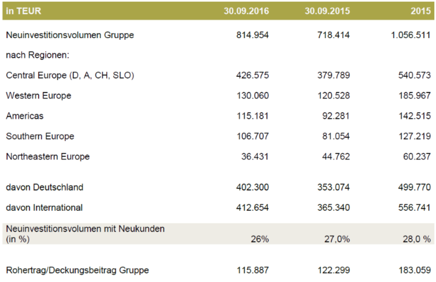 Lebhaftes Wachstum kann auch der Absatzmarkt Americas mit einem Anstieg um 24,8 Prozent gestiegenen Investitionsvolumen vorweisen, das sich auf 115 Mio. Euro beläuft (Q3-2015: 92 Mio. Euro). Der Rohertrag des Gesamtgeschäftes reduzierte sich hingegen leicht um 5,2 Prozent auf knapp 116 Millionen Euro (Q3-2015: 122 Mio. Euro).