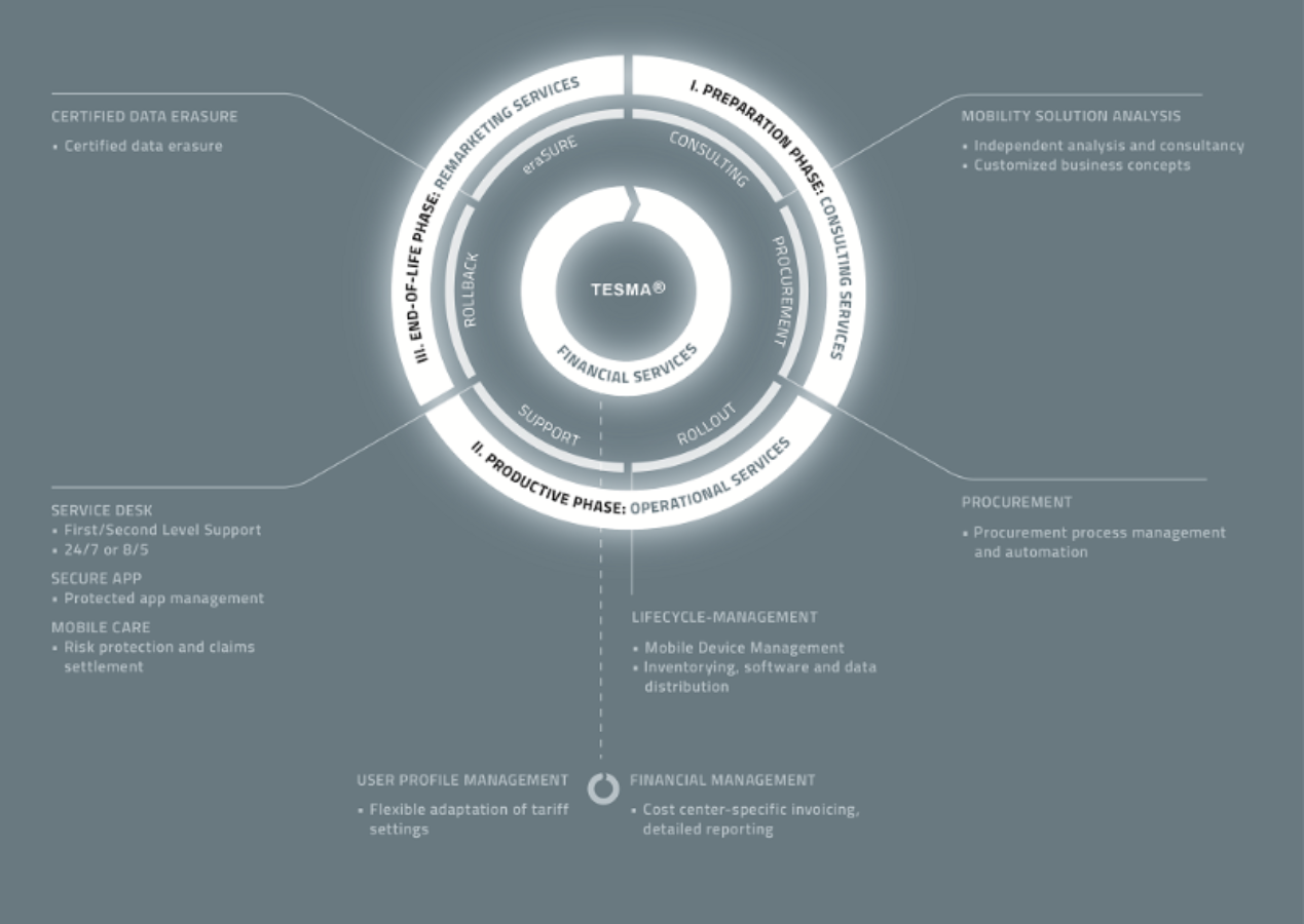 CHG-MERIDIAN provides a wealth of services across the entire technology lifecycle to give its customers both unlimited and secure access to the mobile working world. The result is highly efficient, secure mobile equipment management with no service gaps. Their services range from financing, commissioning, and configuration to claims settlement, repair services, retrieval and certified data erasure. The company shoulders this comprehensive service portfolio on its own, allowing it to remain neutral and independent. This is a sustainable and welcome relief for customers, who are neither required to coordinate multiple service providers, nor to address challenging security questions. And they are no longer burdened with interface-related issues, leaving them with both hands free for their core business activities.